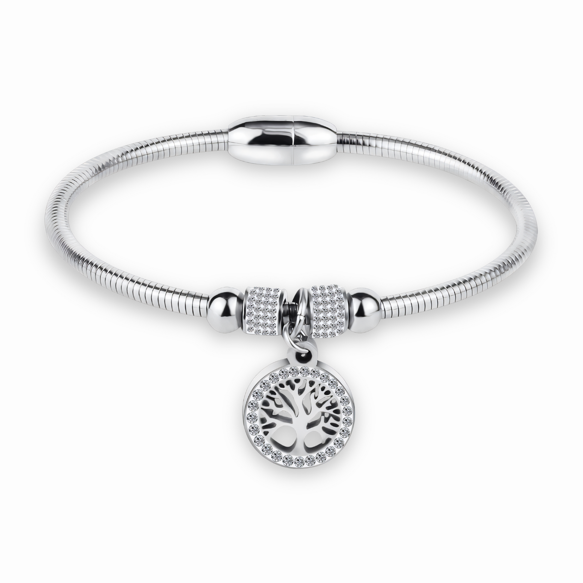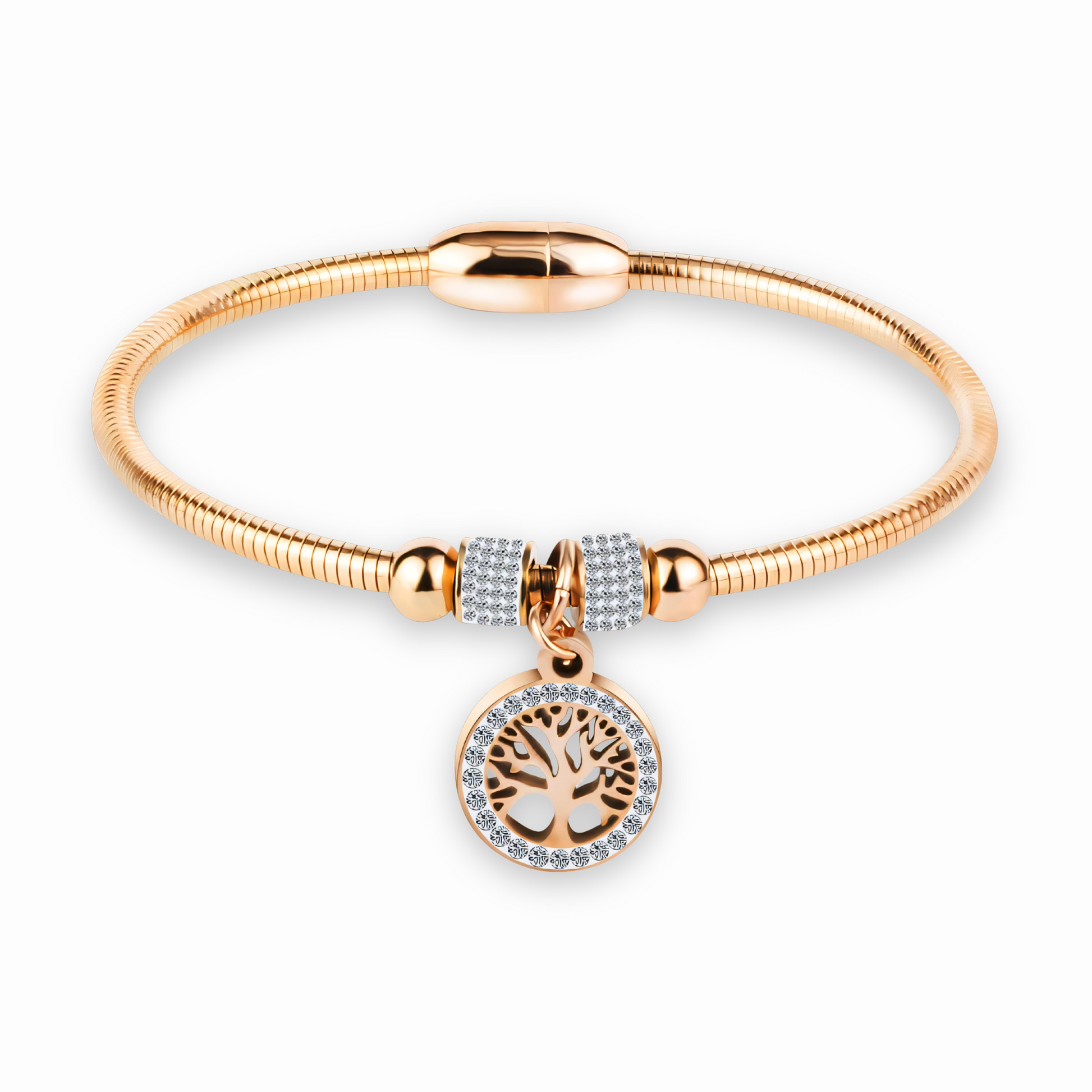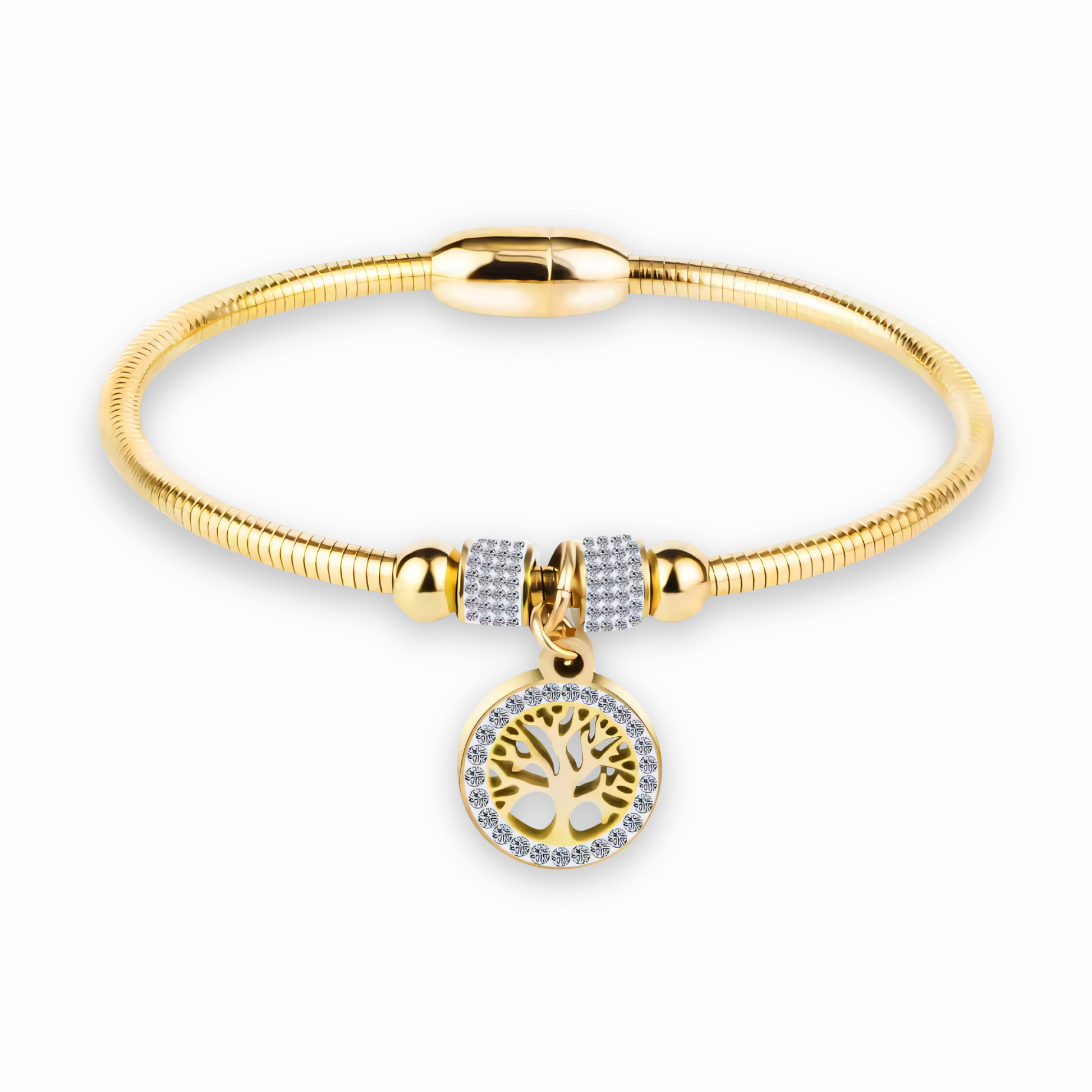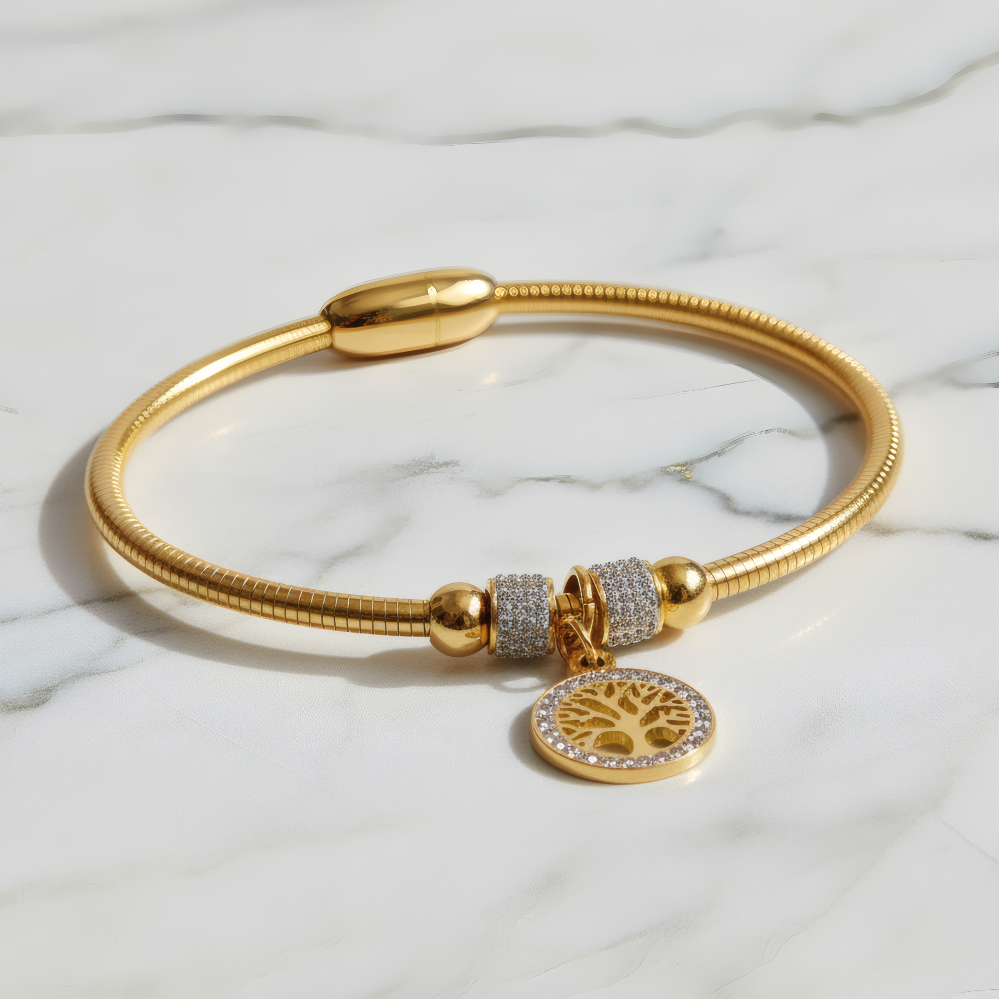 Un bracelet fin en maille souple avec un pendentif d’arbre de vie. Il est entouré d’un pavage délicat qui capte la lumière. Le fermoir est fiable pour le porter tous les jours.