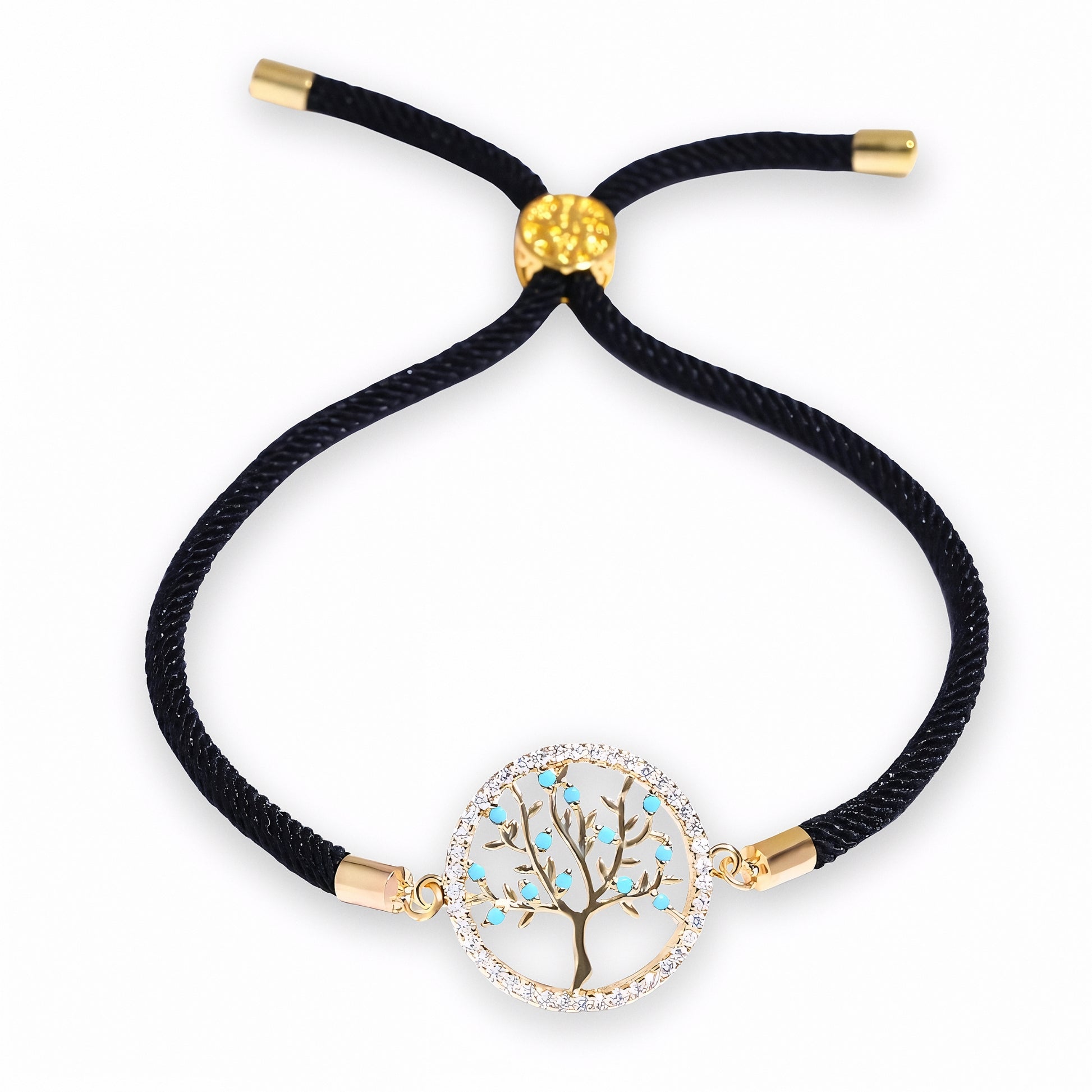 Explore le bracelet Éclat de Vie Turquoise, où l'arbre de vie en or s'épanouit avec des touches délicates de turquoise, orné de cristaux étincelants.  Porté sur un cordon noir modulable pour s'adapter avec finesse à ton poignet, il confère une touche de sophistication et de signification à chacun de tes mouvements.