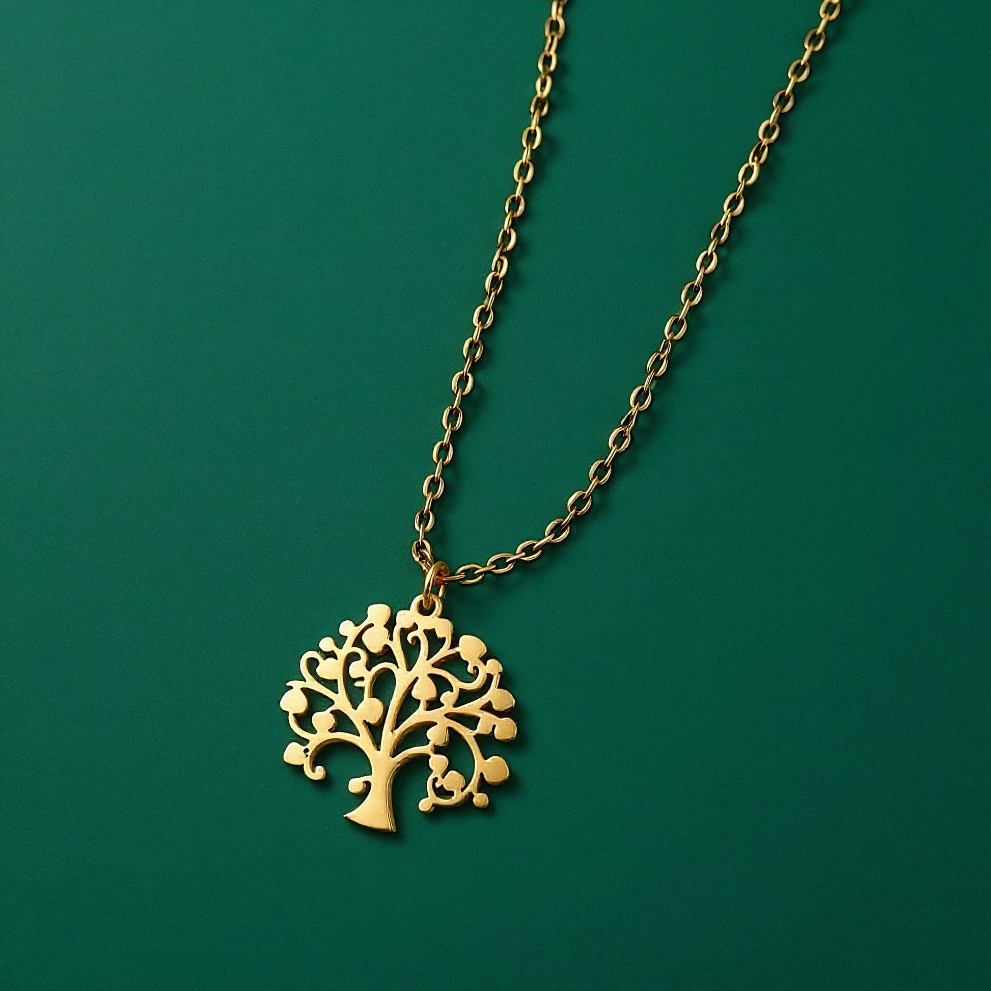 Avec sa délicate finition dorée, ce collier en forme d'arbre reflète la lumière tel un précieux souvenir : chaque ramification minutieusement travaillée illustre la puissance et la vulnérabilité de l'existence.  Léger et s'adaptant à vos gestes, il procure un équilibre entre sophistication moderne et poésie naturelle.