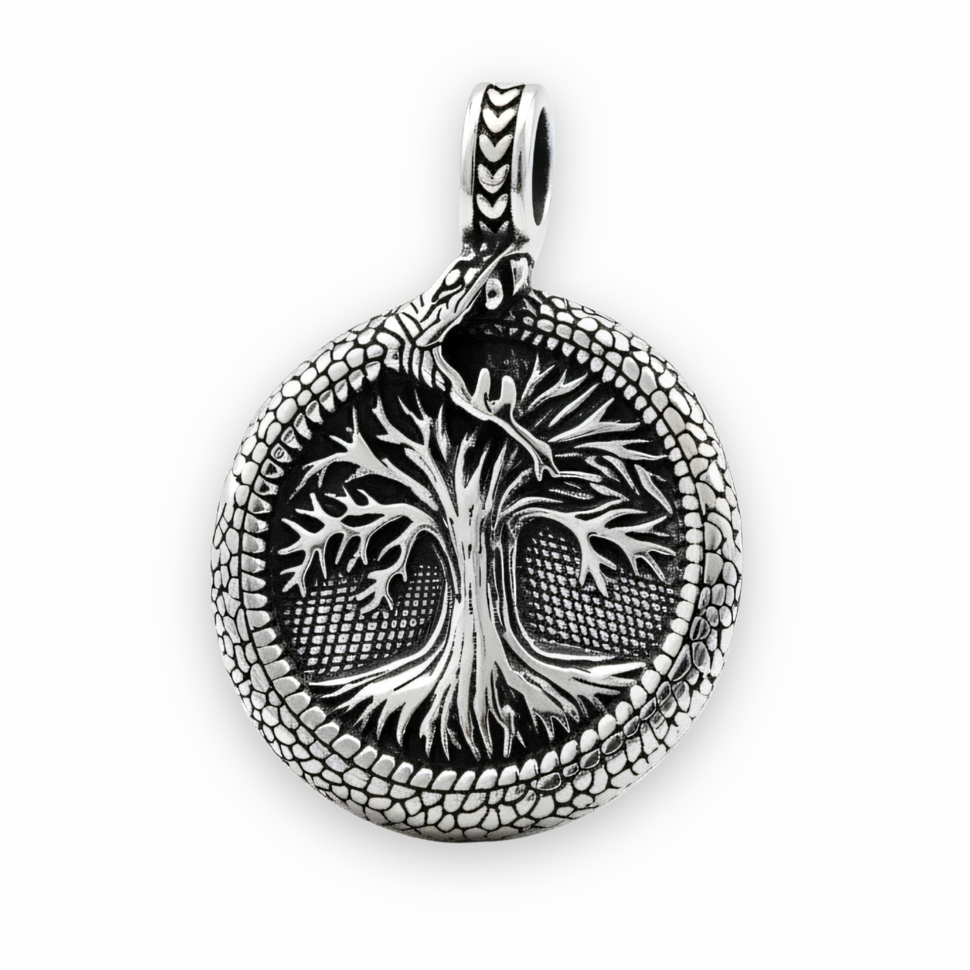 Pendentif rond en Acier inoxydable. Le contour texturé représente un serpent qui se mord la queue, entourant un arbre de vie en relief. Le fond est oxydé pour un contraste saisissant, avec des écailles et une bélière finement gravées.